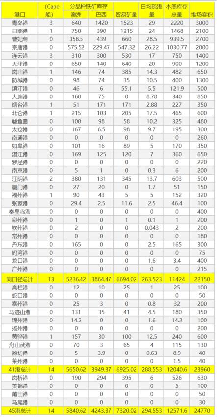 分量方面,澳礦5840.62萬噸降71.85萬噸,巴西礦4243.37萬噸降38.73萬噸,貿(mào)易礦7320.02萬噸增3.36萬噸,球團(tuán)536.57萬噸降20.22萬噸,精粉772.11萬噸降43.57萬噸,塊礦1610.06萬噸增63.72萬噸,粗粉9652.83萬噸降93.62萬噸;在港船舶數(shù)90條降3條。