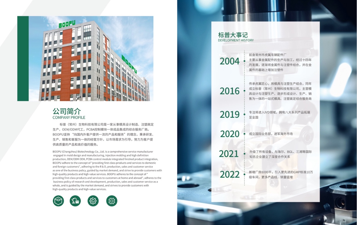 標(biāo)普(常州)生物科技有限公司是一家從事模具設(shè)計(jì)制造、注塑高定生產(chǎn),OEM/ODM代工,PCBA控制模塊一體成品集成的綜合服務(wù)廠商。BOOPU堅(jiān)持“向國內(nèi)外客戶提供一流的產(chǎn)品和服務(wù)”的理念,秉承研發(fā)、生產(chǎn)、銷售和客服為一體的經(jīng)營方針,以市場需求為引導(dǎo),努力為客戶提供高質(zhì)量的產(chǎn)品和高價(jià)值的服務(wù)。