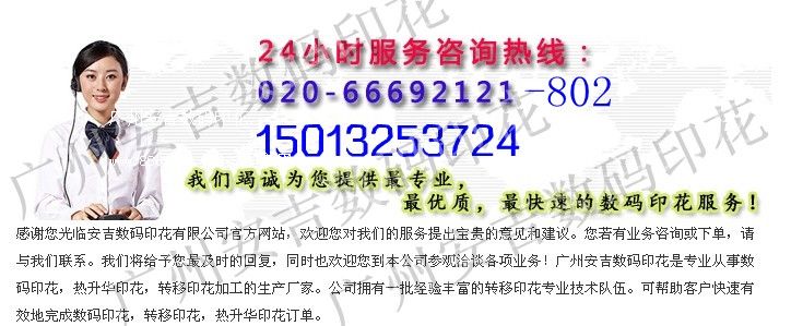 廣州安吉數(shù)碼印花有限公司是一家專業(yè)致力于數(shù)碼印花的領(lǐng)先企業(yè),專業(yè)執(zhí)著,精益求精,迎接變化,勇于創(chuàng)新的創(chuàng)業(yè)理念,專注于數(shù)碼印花加工業(yè)務(wù),以專業(yè)的技術(shù)和優(yōu)秀的品質(zhì)為客戶提供全方位的印花信息,贏得國(guó)內(nèi)外客戶的廣泛好評(píng)。