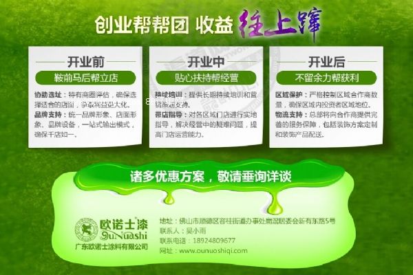 建筑涂料加盟首選歐諾士,享受跨國公司的全套營銷策劃,實地進行指導,開發(fā),現場技術演練。年利潤回報率超過200%!建筑涂料加盟熱線:18924809677