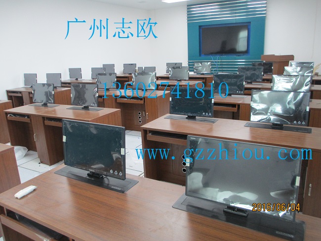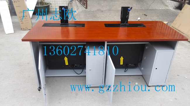 結(jié) 構(gòu):每張桌子配置2臺電動遙控液晶升降機(當時電腦時液晶顯示器自動重桌底升起且顯示器自動通電,當不使用顯示器時,顯示器自動隱藏于桌底),每一個位置都有一個電腦主機位,電腦桌前面設(shè)有檢修門,方便線路維修。