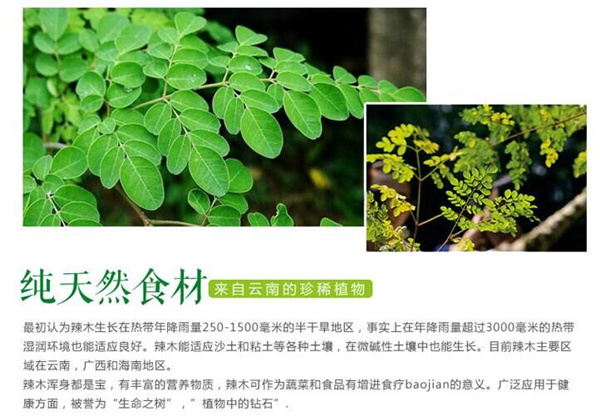 自從辣木樹被證實(shí)是含有豐富高營養(yǎng)價(jià)值的植物后,在歐美、日本等已開發(fā)辣木樹食物的國家,以其高蛋白、低脂質(zhì)、高纖維、高維生素的含量的特性與特殊的降血糖、抗菌消炎、強(qiáng)心的保健效果而成為人們健康食品界的新寵。辣木蛋白質(zhì)含量高,不含膽固醇、辣木具有豐富的各類礦物質(zhì)、辣木含量高的維生素。