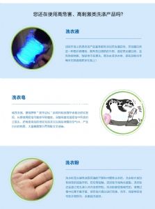 洗衣片綠色無(wú)磷無(wú)毒,不含熒光增白劑,可生物降解成分,無(wú)有害物質(zhì)殘留,洗衣廢水排出一周后,生物降解率達(dá)98.2%,大大減少了對(duì)環(huán)境的污染;