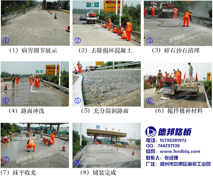 德邦路橋工程(河南)有限公司是國內(nèi)較早從事水泥路面修補材料研發(fā)生產(chǎn)的公司,電話:15738381973。我公司研發(fā)的新型水泥路面快速修補料能夠系統(tǒng)解決水泥路面的裂縫、斷角、啃邊、坑槽、橋梁鋪裝層和伸縮縫等問題。為高速路、國道、省道、縣鄉(xiāng)村道路以及市政工程的改造及修復工程提供了高效、經(jīng)濟的解決方案。德邦路橋憑借先進的技術和過硬的產(chǎn)品,連續(xù)獲得多項榮譽:2016年度全國建材行業(yè)質(zhì)量信用百強企業(yè)、中國建材行業(yè)aaa級信用企業(yè)、全國“重質(zhì)量、守信用”企業(yè)等。