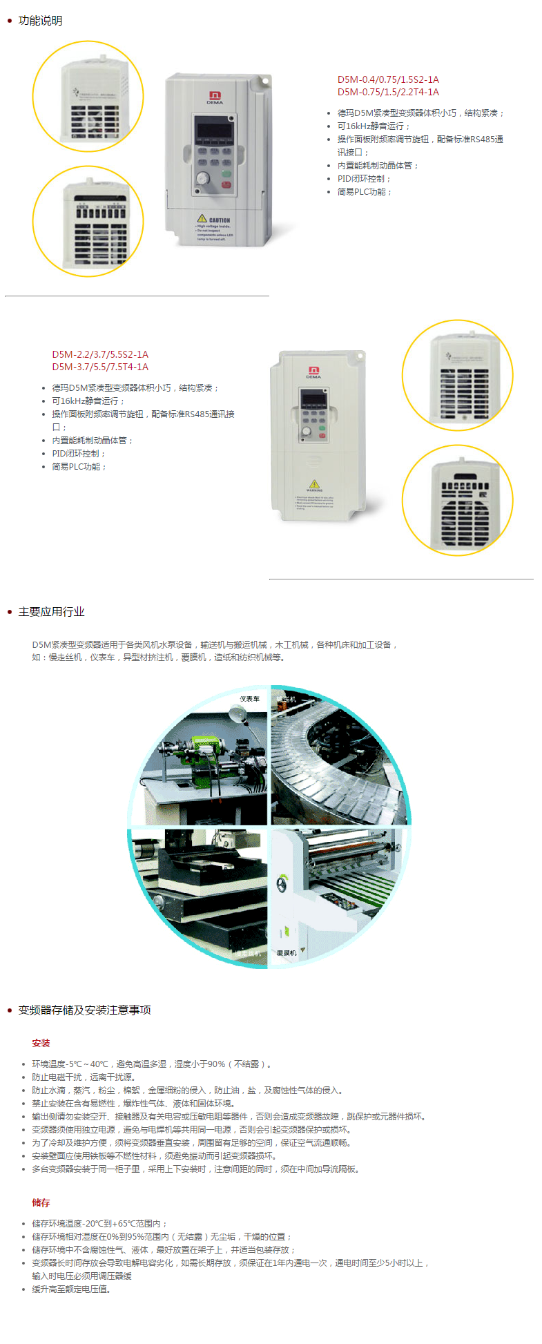 主要應(yīng)用行業(yè):d5m緊湊型變頻器適用于各類風(fēng)機(jī)水泵設(shè)備,輸送機(jī)與搬運(yùn)機(jī)械,木工機(jī)械,各種機(jī)床和加工設(shè)備,如:慢走絲機(jī),儀表車,異型材擠注機(jī),覆膜機(jī),造紙和紡織機(jī)械等。
