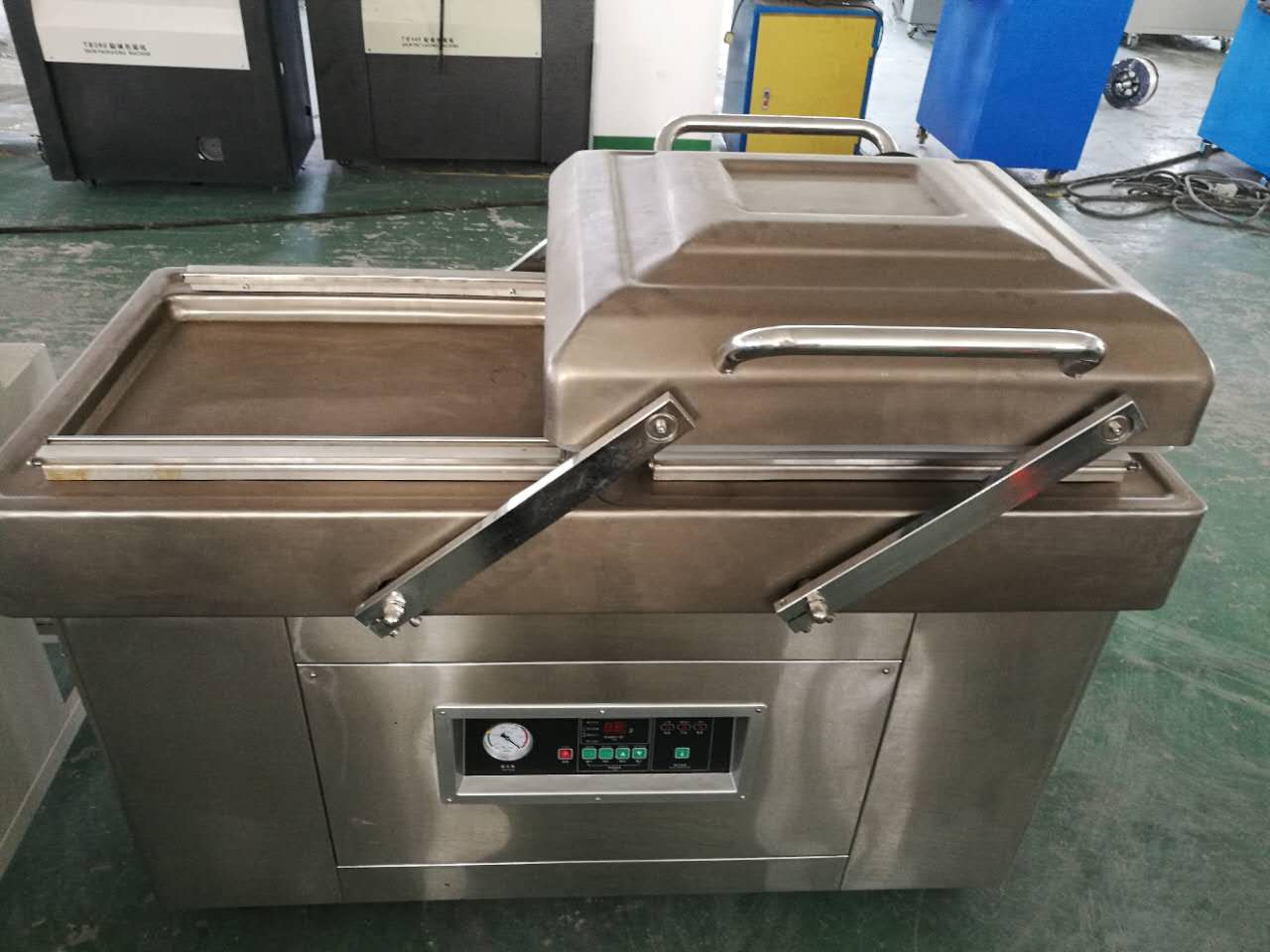特性: 本機(jī)有兩個(gè)真空室輪番工作,上 、下工作室全部采用不銹鋼材料制成,結(jié)構(gòu)合理,氣密性好,美觀耐用,并符合食品衛(wèi)生與防腐的要求,上工作室裝有一組熱壓封口機(jī)裝置,并采用平衡結(jié)構(gòu),可改變?nèi)魏挝恢猛A簦⒂芯彌_保護(hù)。封口溫度分四檔調(diào)節(jié),以改變發(fā)熱變壓器的高低來(lái)達(dá)到不同的封口溫度,熱封時(shí)間繼電壓器來(lái)控制,本機(jī)在封口的同時(shí)可以印上日期等字樣以符合國(guó)家食品標(biāo)簽法定規(guī)定。