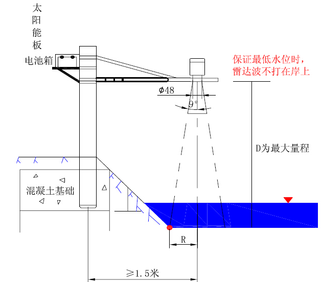 5. 過程連接馬蹄狀u槽,開口直徑≦∮48短管或支架,盡可能保證雷達(dá)軸線垂直于水平面、探測(cè)區(qū)域或探頭下方?jīng)]有障礙物影響,位置在雷達(dá)探頭中心軸線距離岸邊≧1.5m(詳見---安裝圖示)。