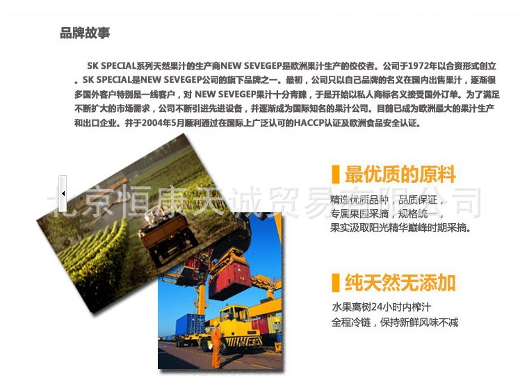源自在國際市場上有“地中;▓@”美稱的塞浦路斯,地中海型的氣候以及該國的地理環(huán)境,該國盛產各種水果蔬菜。sk果汁能增強免疫力、減少生病、延緩衰老。長期飲用,消化系統(tǒng)和呼吸道患癌癥的危險降低,同時還能有效防止動脈粥樣硬化和冠狀肌能不全的發(fā)展。sk果汁不僅讓我們大飽口福,還為身體提供健康不可缺少的天然化合物:果糖、酶、礦物質、有機酸、蛋白質和維生素。sk果汁采用無菌棱柱形包裝盒,這種包裝盒除了造型別致,還使果汁中的營養(yǎng)成分得以完好的保存,復合包裝材料和真空狀態(tài)使果汁免受光、氣、異味和微生物的侵入,從而更容易長時間儲存。sk設計獨特的盒蓋系統(tǒng),增加了產品的方便性。總之,每天飲用sk果汁,你會備感精力充沛,情緒飽滿,健康且長壽。