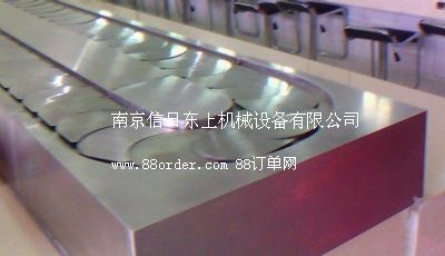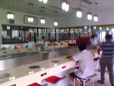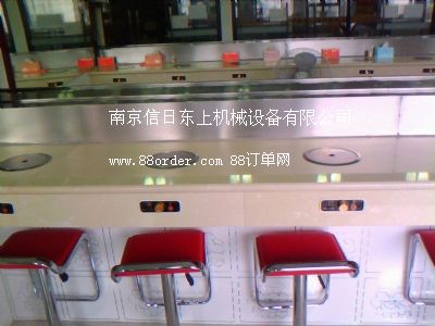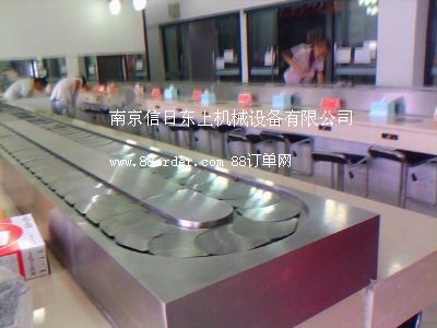 火鍋旋轉臺 壽司旋轉臺 自助旋轉臺鏈板及鏈條均采用304磨沙面沖壓而成,板厚1.8mm,寬度140mm,鏈條節(jié)距100mm,鏈條下部分導軌面板采用304銹鋼鏡面,板厚度為1.2mm,內(nèi)部采用白色防摩尼龍墊條,旋轉吧臺,壽司料理,旋轉火鍋,自助火鍋餐廳。下架采用30mm*30mm*1.5的碳鋼方管焊接而成,表面經(jīng)過防銹處理,所有連接部分均采用標準件連接,便于移裝;疱伒晷D臺 壽司店旋轉臺 自助火鍋旋轉臺,適應了飲食界推陳出新,適應了現(xiàn)代人對飲食新奇的追求;疱佇D臺 壽司旋轉臺 自助旋轉臺是你從事餐飲火鍋行業(yè),日本料理,韓國料理必備前衛(wèi)機械設備.