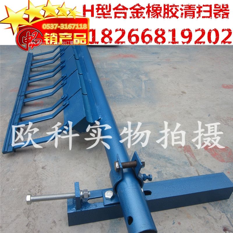 h型硬質(zhì)合金清掃器安裝于頭部卸料滾筒處,清除輸送帶上的粘附物料,完成一次清掃。