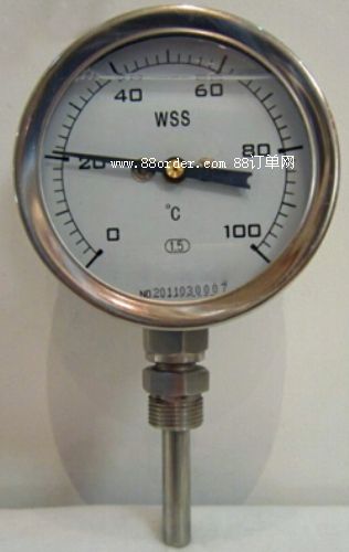 例a:萬向型,表盤直徑φ100,測溫范圍0~400℃,1.5級,活動外螺紋m27×2,長度450mm,zy-wss-481, 0~400℃,l=450, m27×2,1.5級。