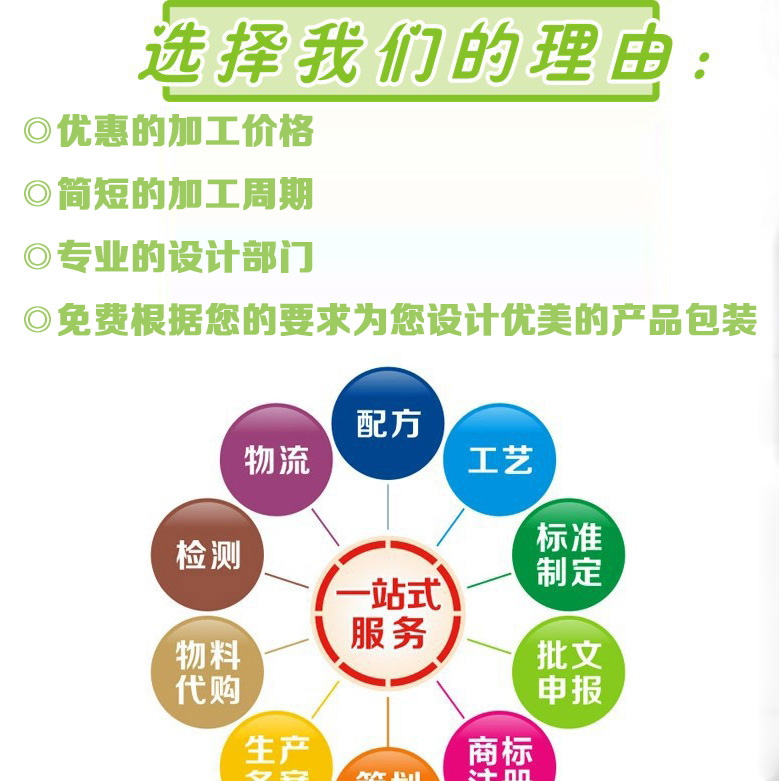 4、客戶自帶批文、商標、原料、配方,我方按要求加工;