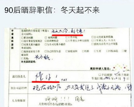 辭職信上二十多個(gè)選擇她都沒(méi)有勾,只是揚(yáng)揚(yáng)灑灑的寫(xiě)下了七個(gè)大字,冬天太冷,起不來(lái)。從筆鋒來(lái)講,真的是力透紙背,毫不手軟。