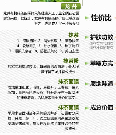 純凈肥沃的有機(jī)土壤中成長的綠茶,采用“低溫瞬間殺菌法”將新鮮的有機(jī)龍井進(jìn)行處理,釋放原料生物細(xì)胞的有效成分,萃取高純度的抹茶粉,真正保留龍井有效成分的最大活性,使得面膜中的超細(xì)營養(yǎng)能夠更好的穿透表層肌膚,真正從內(nèi)部改善面部肌膚問題。