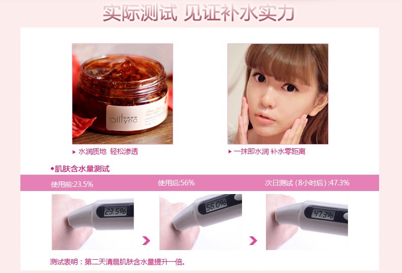 測(cè)試表明:第二天清晨肌膚含水量提升一倍。