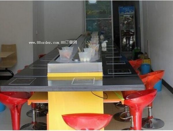 旋轉(zhuǎn)吧臺(tái),壽司料理,旋轉(zhuǎn)火鍋,自助火鍋餐廳。下架采30mm*30mm*1.5的碳鋼方管焊接而成,表面經(jīng)過(guò)防銹處理,所有連接部分均采用標(biāo)準(zhǔn)件連接,便于移裝。