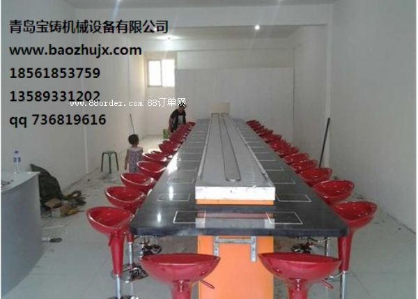 2、節(jié)省人力物力:客人在各自的座位上可隨意選擇擺放在輸送帶上的食品,無需服務員送上,而且設備有餐臺,可節(jié)省大量餐桌及臺布。事實證明,該設備是投資少,運行費用最低、回報率最高的餐飲設備。