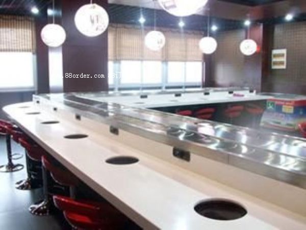 內(nèi)部采用白色防摩尼龍墊條,旋轉(zhuǎn)吧臺(tái),壽司料理,旋轉(zhuǎn)火鍋,自助火鍋餐廳。