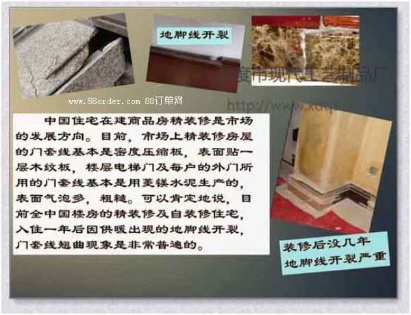 3、中國(guó)住宅在建商品房精裝修是市場(chǎng)的發(fā)展方向。目前,市場(chǎng)上精裝修房屋的門套線基本是密度壓縮板,表面貼一層木紋板,樓層電梯門及每戶的外門所用的門套線基本是用菱鎂水泥生產(chǎn)的,表面氣泡多,粗糙。目前全中國(guó)樓房的精裝修及自裝修住宅,入住一年后因供暖出現(xiàn)的地腳線開裂,門套線翹曲現(xiàn)象是非常普遍的,而仿真彩色大理石浮雕制品,硬度大,不變型,不開裂,防水防潮防霉,將陸續(xù)成為用戶的新選擇。