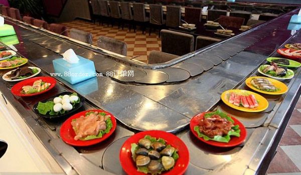 然后輸送帶就會帶著食材圍繞店鋪的座位循環(huán)回轉(zhuǎn)。工作人員站在原地就可以隨時補充新鮮的食材,而不用到處跑動,最大限度的減縮了人力資源成本的損耗。而消費者也不用再看哪些枯燥無味的菜單,
