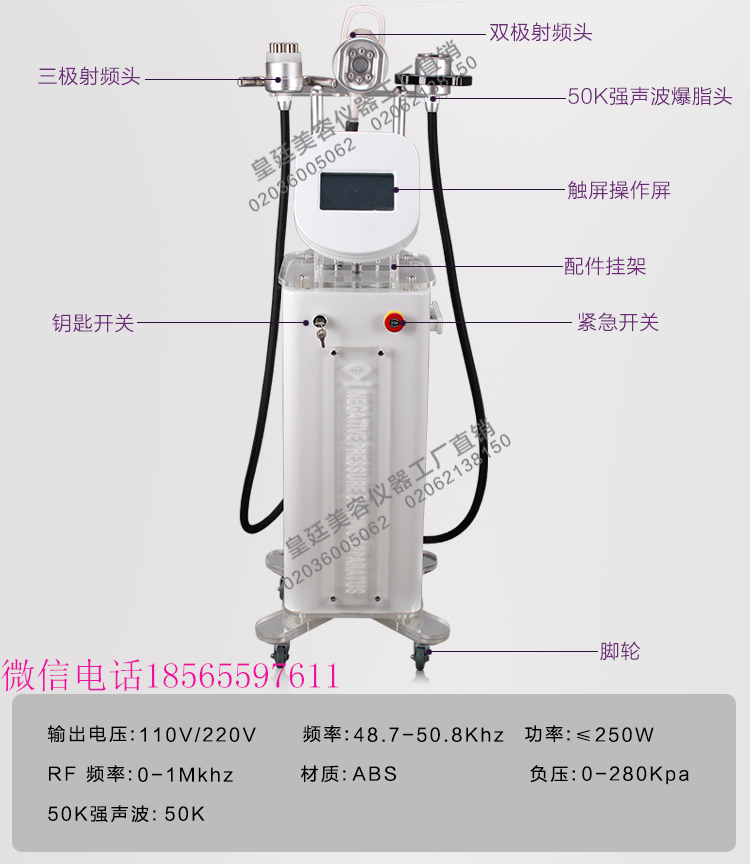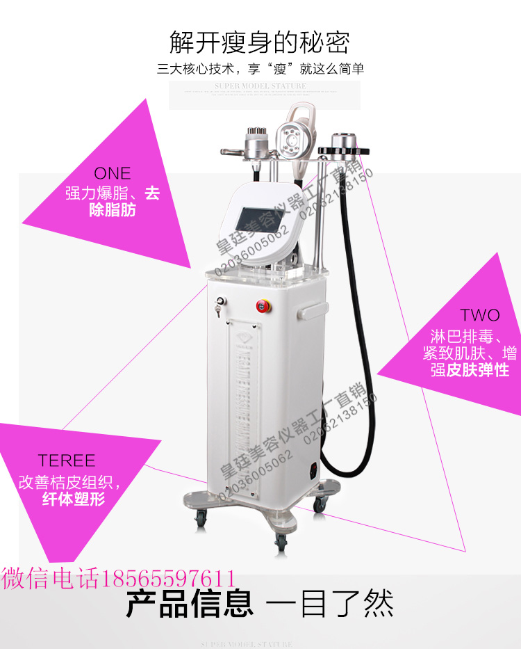 儀器功效:50k聚焦振脂強(qiáng)聲波、去除脂肪;rf射頻溶脂,溶解脂肪、淋巴排毒、緊致肌膚,增強(qiáng)皮膚彈性;真空負(fù)壓吸脂移脂,改善桔皮組織,纖體塑形、bio+冷光