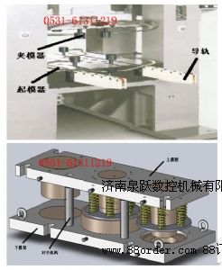 主機(jī)外安裝導(dǎo)軌,主機(jī)內(nèi)安裝彈簧起模器。拆換模具時(shí)松開(kāi)夾模器,彈簧起模器頂升,與主機(jī)外導(dǎo)軌在同一水平線上,用人力可輕快的將上下模架(包括磨具)拉出,在主機(jī)外導(dǎo)軌上吊走。另一備好的待換模具模架,可由行車吊裝降落在主機(jī)外導(dǎo)軌上,用人力可輕快的將模具推入機(jī)臺(tái)內(nèi),如此便實(shí)現(xiàn)了模具快速進(jìn)出工作臺(tái)。