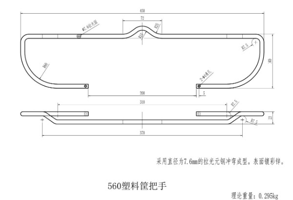 560塑料筐把手采用φ7.6mm拉光圓鋼經(jīng)沖彎、鉆孔、電鍍工藝形成。要求工件外形平整、對稱,表面鍍彩鋅,鍍層厚度0.5-0.7mm。工件展開長度約830mm,工件重量約295g。工件結(jié)構(gòu)按圖紙要求。年需求量300萬只左右,首批定購數(shù)量為20萬只。請供應(yīng)商按下要求填制報價單:報價是否含稅、供貨時間、電鍍質(zhì)保時間、含運費價格等。